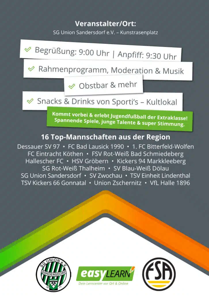 Am 28. Juni ist es wieder soweit: Die SG Union Sandersdorf e.V. lädt ein zum easyLEARN CUP 2025 – dem großen U11-Turnier mit 16 Top-Mannschaften aus der Region! Auf dem Kunstrasenplatz in Sandersdorf rollt ab 9:30 Uhr der Ball, die offizielle Begrüßung startet um 9:00 Uhr. Freut euch auf mitreißende Spiele, leidenschaftliche junge Talente und eine großartige Atmosphäre. Mit dabei sind unter anderem der Hallesche FCVfL Halle 18961. FC Bitterfeld-WolfenFC Eintracht Köthen und viele weitere Vereine, die den regionalen Jugendfußball prägen. Neben dem sportlichen Geschehen erwartet die Besucher ein buntes Rahmenprogramm mit Moderation, Musik sowie leckeren Snacks & Drinks von Sporti’s – dem Kultlokal der Region. Als Mitveranstalter unterstützt easyLEARN – Die Profinachhilfe für Schüler der 1. bis 12. Klasse das Turnier mit voller Überzeugung. Mit zehn Standorten steht easyLEARN für individuelle Lernförderung und echte Bildungsqualität. „Bildung, Bewegung und Sport liegen uns am Herzen und sind wichtig für unsere Kinder. Wir freuen uns, dass wir gemeinsam mit der SG Union Sandersdorf dieses regionale Sporthighlight veranstalten können. Alle Eltern, Kinder und Interessierten sind herzlich eingeladen vorbeizukommen und anzufeuern.“ – René Klickermann, Geschäftsführung easyLEARN